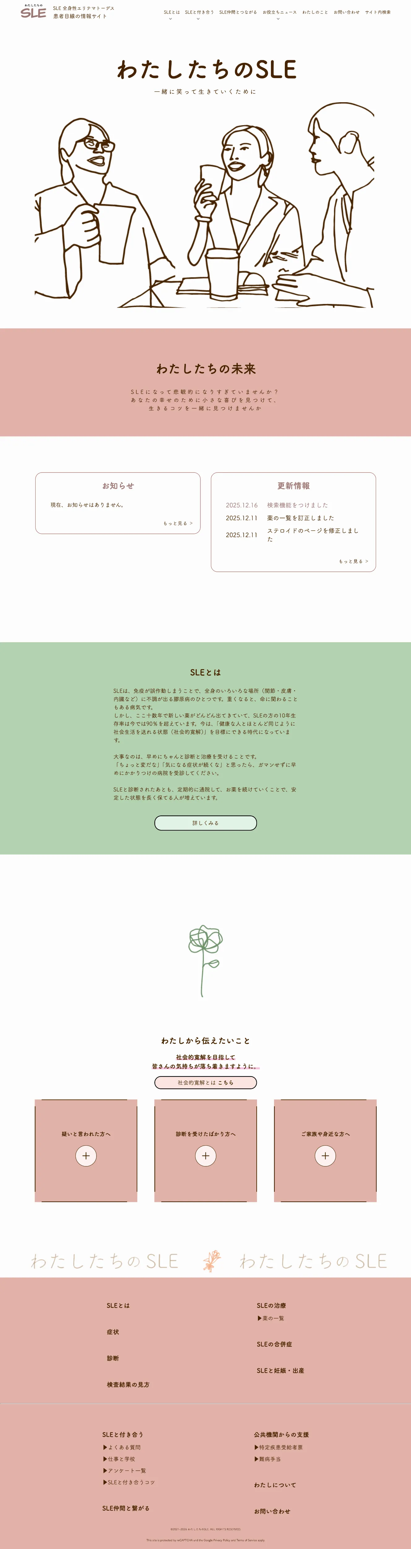 - 全身性エリテマトーデス(SLE)は希少な病気であり共感を得るのが難しく孤独感を感じます。Webサイトも患者が作ったものがなく患者同士が共感し合えて相談も出来るサイトを作りたいと思いました。